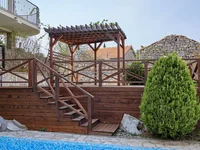 The site on which the object is built is landscaped and fenced. Townhouse located in a residential building built in the village of Vranovichi. The entire space on which the building is built is finished, half paved with stone, planted with greenery, fenced with stone fence and luxuriously decorated. The building itself is beautifully built and equipped with appliances. In the house, the floors are connected by an internal staircase. The building has secure parking, asphalt.