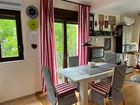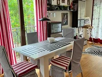 The complex has its own indoor garden with a swimming pool, sunbeds, trees and a separate area for barbecue, so the apartment offers a view of vegetation: mountains and a garden.