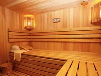 Sauna - relaxation of the soul and body for six people; finishing from a noble tree abachi; Finnish wood-burning stove HARVIA.