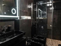 All apartments have three-chamber windows, suspended ceilings, designer lighting, walls glued with modern designer wallpaper, natural parquet board, “warm floor” system, plumbing Villeroy & Boch – shower cabins or bathrooms, floors – marble and granite of the company “Travertini”, mosaic tiles made of Venetian glass of the company “Valentino”.
