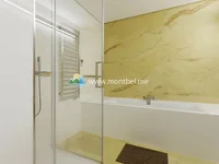 The apartment has a large living room, a fully equipped kitchen, 2 bedrooms, and 3 bathrooms. It features exceptional panoramic windows, high ceilings, a well-designed area, and a wonderful view of the Adriatic Sea and St. Nicholas Island.
