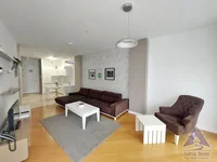 Inside the building, there is a SPA center with an indoor pool and a rooftop restaurant, as well as banks, cafes, restaurants, shops, and boutiques. The apartment covers a generous 64 square meters and has a one-bedroom layout. It consists of a functional kitchen, a living room framed by panoramic floor-to-ceiling windows that offer views of greenery and the city. Additionally, there is one bedroom with access to a terrace and a bathroom with a shower cabin."