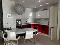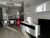 The apartment is equipped with premium appliances: there is a water filter, a large built-in coffee machine, and an oven. There is a wine cabinet, a large Sony TV