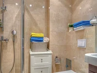 On the ground floor there is a kitchen combined with a living room and a bathroom. The second floor has three bedrooms. The apartment is not only fully furnished, but also equipped with all the necessary appliances. All rooms have air conditioners. There is a garage of 16 m2. Within walking distance from the apartment are shops, cafes, post office, bus stop. The distance from the sea is only 340 meters.