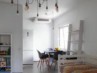 House on the left. Semi-basement (designed as commercial): entrance hall, bathroom with shower, living room, bedroom with double bed and single bed, technical room with heat pump.