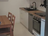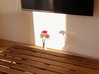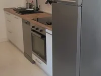 - hallway, living room with kitchen and dining area, bathroom with shower and toilet, one bedroom, terrace