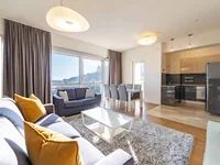 The apartment has an open-plan living room with a kitchen and dining area, two bedrooms, two bathrooms, and a spacious terrace. There is a view of the sea from the terraces, the Dukley Gardens complex on one side, and the Old Town on the other.