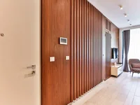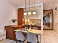 The apartment is divided into an entrance hall, a living room with a dining room, a kitchen, a sleeping area, a bathroom and a terrace.