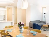 🔖Apartment layout: living room with kitchen and dining area, 2 bedrooms, 2 bathrooms.