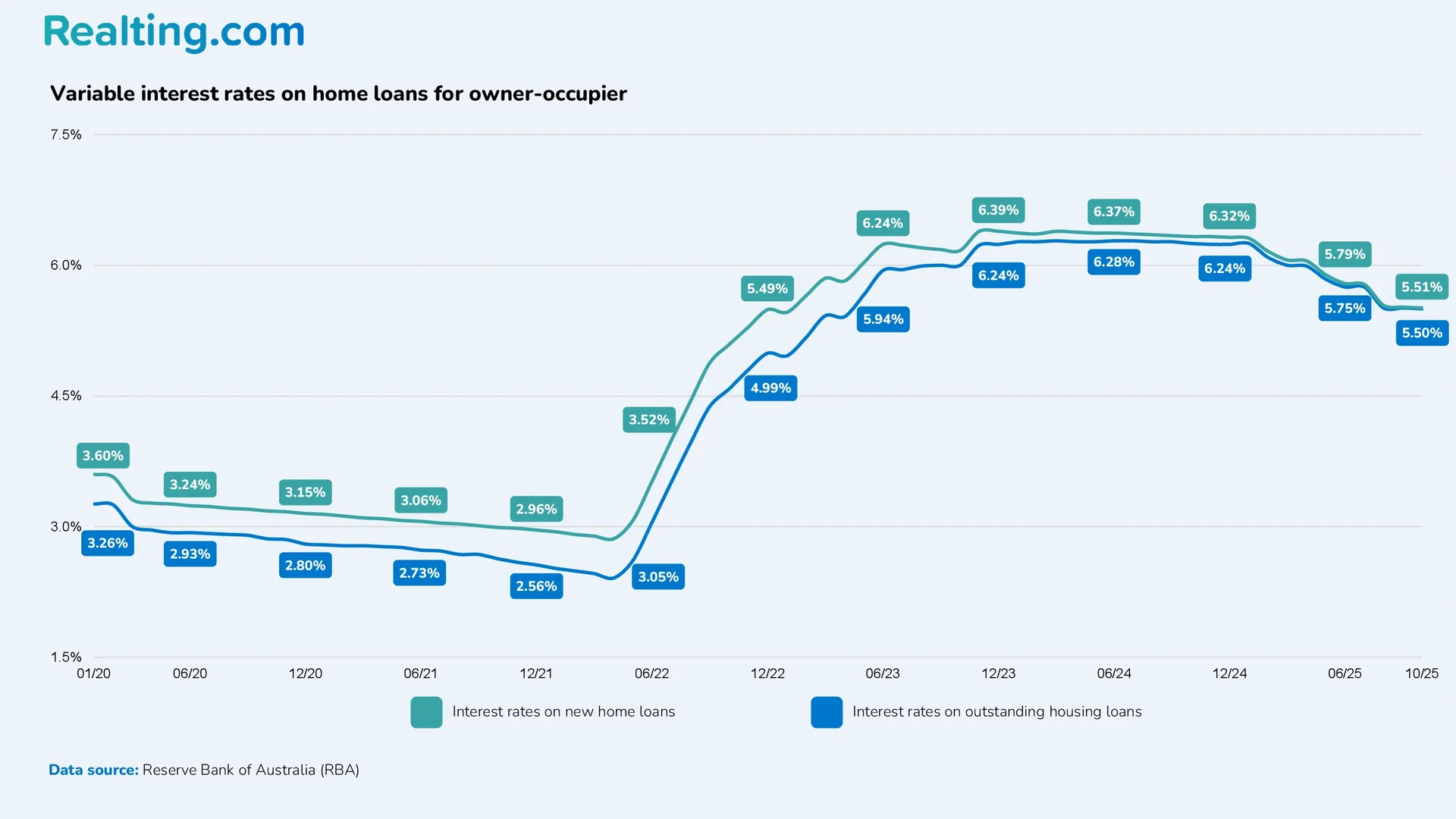 According to Reserve Bank of Australia statistics, mortgage interest rates decreased throughout 2025. If at the beginning of the year the average interest rate for new home loans was 6.25%, then by October the rate had dropped to 5.50%. However, current loan rates are still much higher than a few years ago.