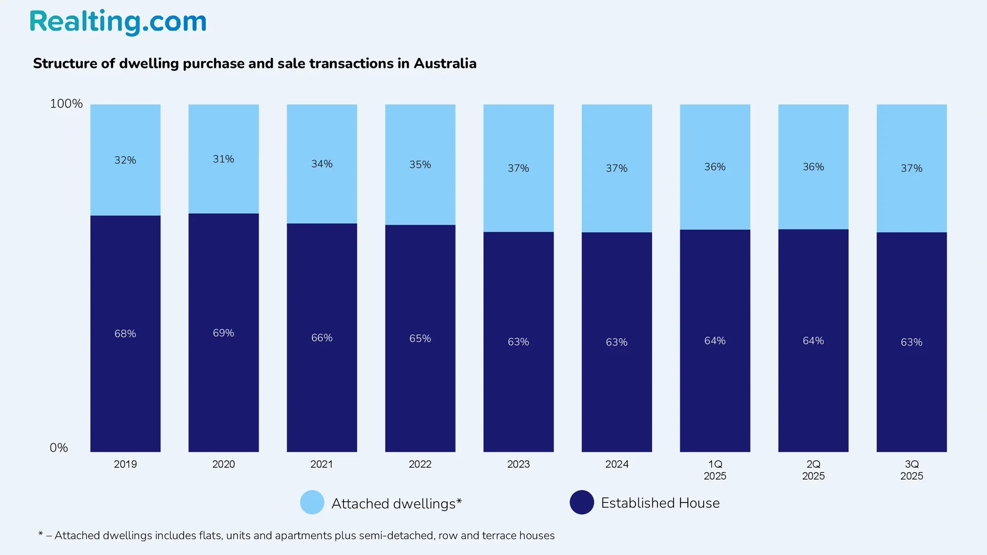 Traditionally, detached houses (Established house*) are the most popular on the Australian housing market, accounting for almost two-thirds of all housing transactions in the country. All other housing transactions are deals with attached dwellings**, which also include townhouses, semi-detached houses, and apartments.
