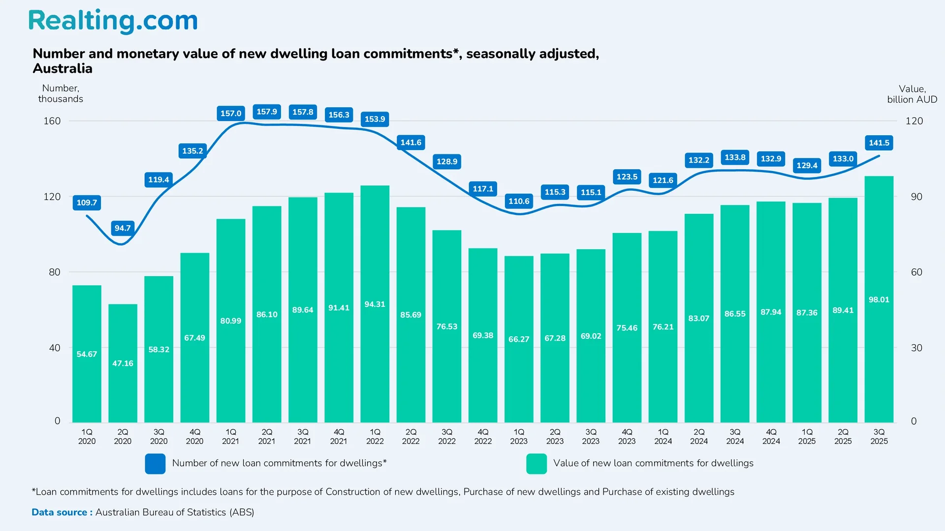 Following the rate reduction, both the number of new home loans and their volume increased. The number of new home loans issued in the 3rd quarter of 2025 amounted to 141,470, which is 5.76% more than in the 3rd quarter of 2024. The volume of new loans issued amounted to 98.01 billion AUD, which is 13.23% more than in the 3rd quarter of the previous year. Note that 59.3% of all loans were issued for owner-occupation purposes; the remaining 40.7% are investment loans. Investment loans are generally more expensive in terms of interest rates and require a higher down payment.