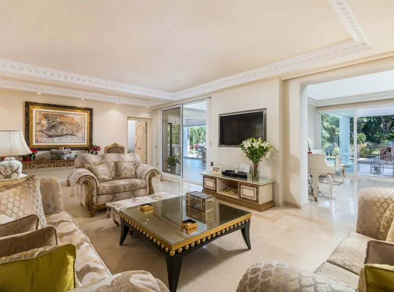 A villa is for sale in the town of Benahavis for € 2,950,000. A distinctive feature of this home is that it is located on the first line of the golf course in Nueva Atalaya. The cottage stands in an elevated position with panoramic views of the golf course, the sea, and the La Concha mountains.