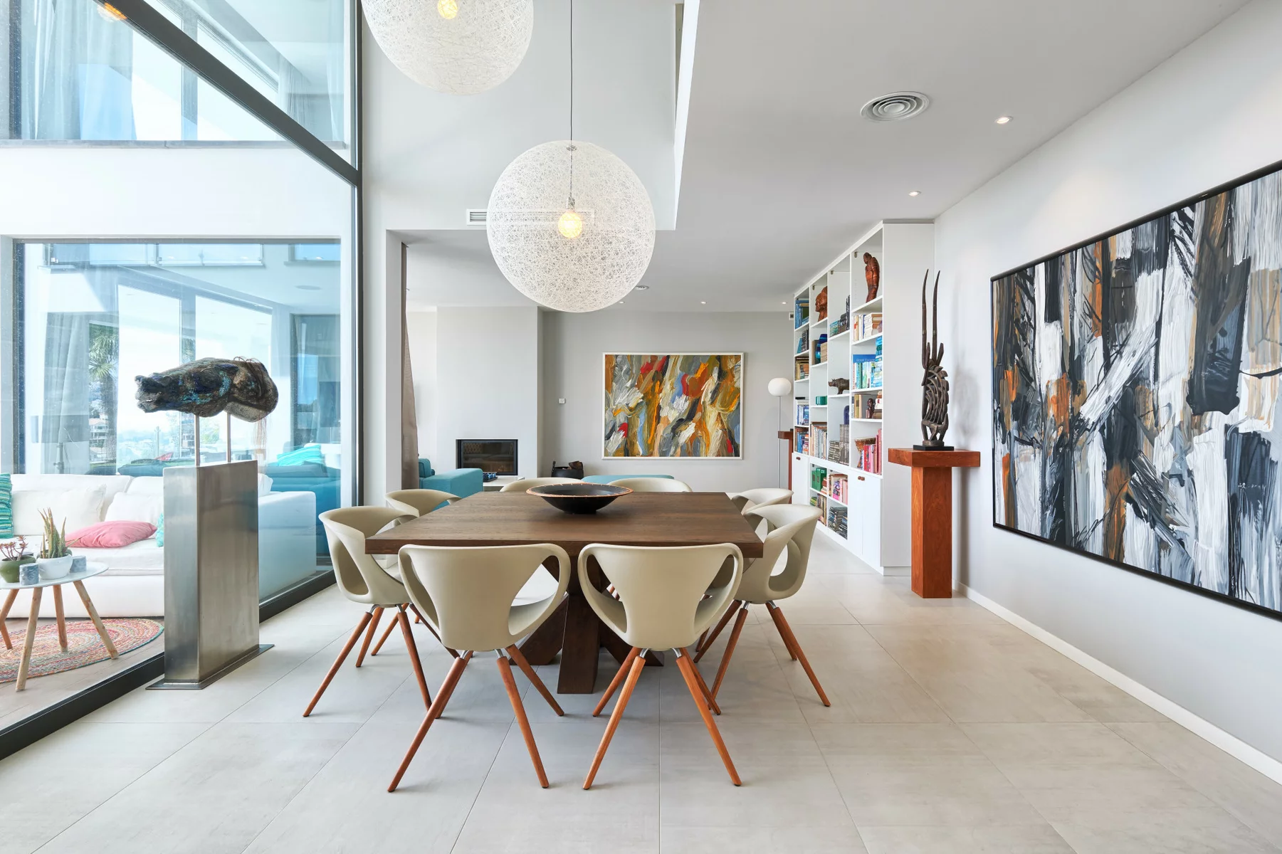 The house, in addition to its six bedrooms, has a gym, an indoor spa center, a personnel room, and a solarium terrace overlooking the sea. Each bedroom has access to its own terrace, the master bedroom also has a dressing room.