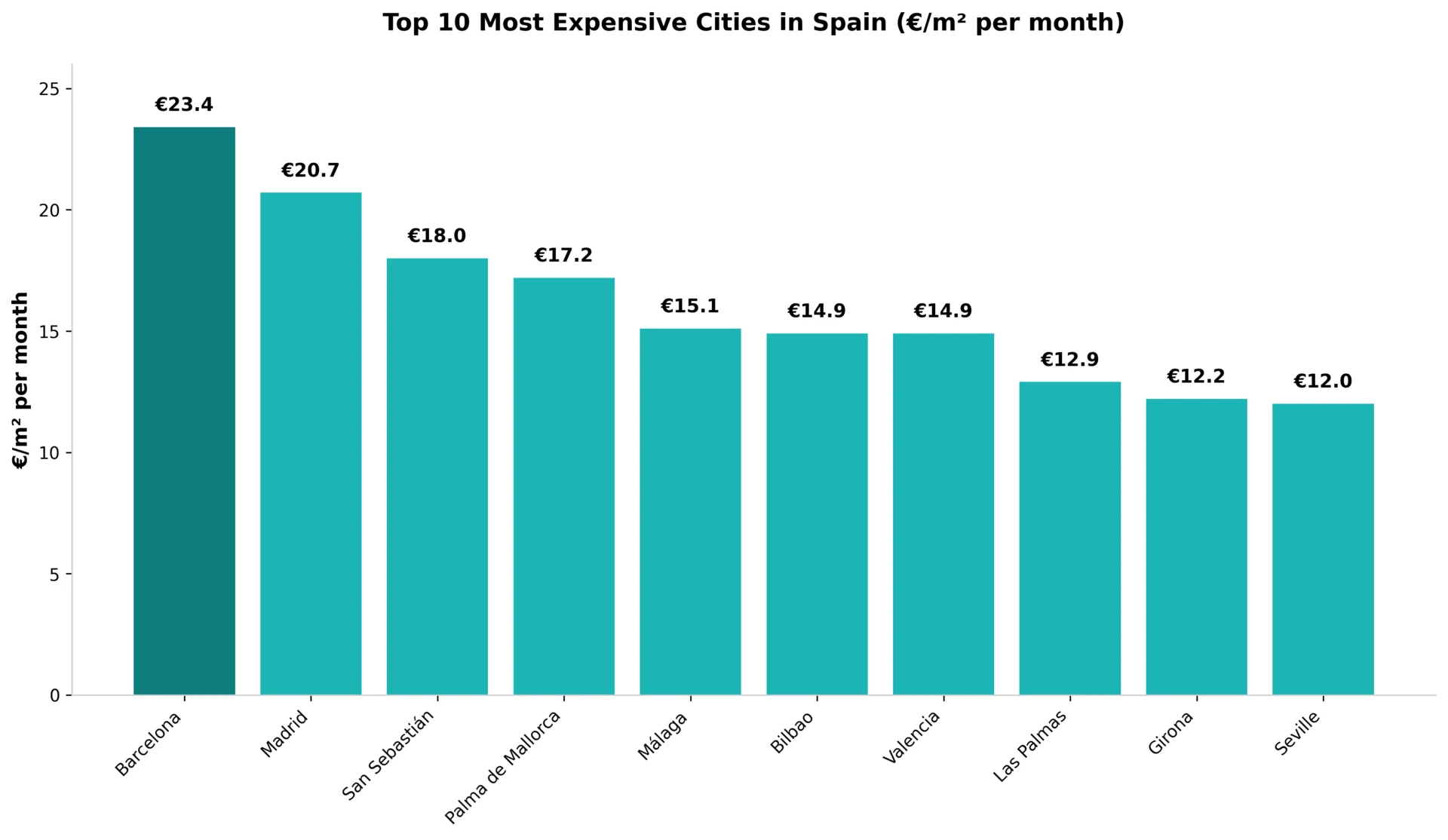 In Madrid the square meter costs €21.1 according to April 2025 data. Prices grow by 15 % per year — faster than in Barcelona.
