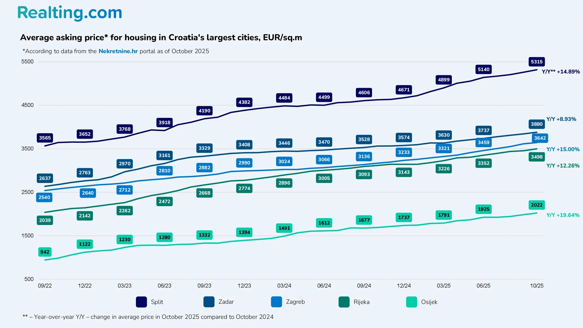 Among the most populous cities, the highest average housing price is in Split — the country’s second-largest city and the centre of the Dalmatia resort region. The average asking price in October 2025 here reached 5,315 EUR/sq.m. Below is a chart with the average asking price for housing in the five largest cities in Croatia.