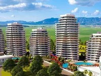 The sea-view real estate is situated in a project on 3300 sqm of total land. The project consists of 4 blocks with 10, 13, 15, and 18 floors. There is a total of 416 flats available in the project, an addition to the hotel with 60 rooms that can host your visitors. In the project, there is an aquapark, indoor and outdoor pool, fitness, game room, SPA, Turkish bath, sauna, beauty salon, pool bar, terrace bar, a la carte and open buffet restaurant, mini golf, courts for volleyball, basketball, tennis, and handball, amphitheater, game area, a souvenir shop, ATM, reception and caretaking services, recreation areas, outdoor car park, 24/7 security, security cameras, free shuttle services to the city center, and supermarket services.