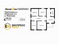 Powierzchnia domu wynosi 120,4 metrów kwadratowych. metrów. Kompaktowy układ. Dom składa się z 4 pokoi, korytarza, łazienki, pieca, ganku. W jednym z pokoi zaplanowano kuchnię. Okna, drzwi wejściowe do domu są drewniane.