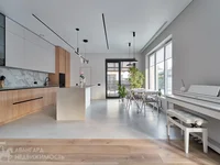 Pierwsze piętro. Przestronny salon z kuchnią i okna panoramiczne, który zapewnia dużą ilość naturalnego światła i wizualnego wzrostu przestrzeni. Z kuchni wyjście na taras, oddzielny magazyn do przechowywania. garderoba, łazienka, biuro, hala i korytarz.