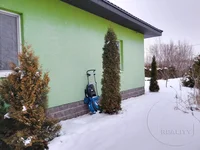 Dom wiejski - bungalow zbudowany w 2014 roku. Fundamentem jest taśma monolityczna / betonowa. Ściany są blokowane izolacją w systemie Thermoshub. Tynkowana i malowana farbą czołową UVO. Dach pokryty jest metalowymi płytkami. Okno na poddaszu. Okna i wyjście na taras - PVC. Drzwi frontowe są metalowe.