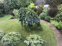 Malownicza działka z pięknym krajobrazem: zadbane trawniki, kwiatki, rośliny ozdobne, mały staw.