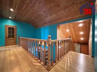 - Górne piętro zachwyca wykończeniem: sufit jest otoczony naturalnym drewnem z oświetleniem punktowym, ściany malowane są turkusowym niebieskim, tworząc uczucie lekkości i świeżości. Drewniana klatka schodowa z balustradami i deską korkową jako dekoracyjny akcent harmonizuje z drzwiami tablicy ciemnego drewna. Laminat ciepły miodowy cień ogrzewa nogi i oczy.