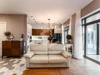 Sercem apartamentu jest kuchnia - pokój dzienny z dostępem do tarasu z pięknym widokiem. Taras wyposażony jest w meble.