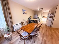 Bright dining room with access to a terrace and connection to a modern kitchen with a window