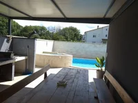 Adjacent to the pool is a covered terrace with a barbecue area.
