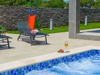 Tutaj znajdziesz musujący basen, idealny na ciepłe dni letnie, jak również praktyczną kuchnię letnią, leżaki i grill z węglem zewnętrznym. Z dużą ilością miejsca na relaks, rozrywki i opalania, ten taras z pewnością będzie twoim ulubionym miejscem w domu. Dla maksymalnego relaksu i komfortu, basen oferuje zarówno powietrze, jak i opcje hydromasażu i posiada wszystkie niezbędne wymagania dotyczące instalacji pompy ciepła do podgrzewania basenu i wodospadu. Basen pracuje z wysokiej jakości techniką z elektrolizy, Zodiac TRI Expert 18 system z Astral Victorias + pompy, filtr szklany i drenaż i zawór wentylacyjny. Ale to nie wszystko - w tym domu znajduje się także jeden wspaniały ogród 250m2 ze specjalną trawą Arizona, automatyczne nawadnianie w czterech strefach i oświetlenie LED z 12 lamp zewnętrznych.