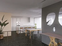 Na pierwszym piętrze znajduje się gościnna toaleta, otwarta przestrzeń mieszkalna z kuchnią i jadalnią z dostępem do tarasu i basenu.
