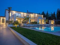 It is being sold fully furnished and equipped, enabling the new owner to move in and live in luxury immediately. The exterior landscape is a green oasis encompassing a total of 1753 square meters, adorned with an array of lush greenery, including large palm trees and cypresses. This idyllic property is complemented by additional storage space of 33 square meters, a heated 40-square-meter pool, parking for 8 cars, and a spacious summer kitchen of 35 square meters.