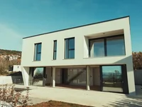 Na zewnątrz willa cieszy się wyrafinowaniem ze stolarką systemową Schuco wyposażoną w bezpieczne szkło typu low-e, rolety elektryczne Roltek napędzane przez stan-of-the-art Somfy silników, a także dodatkową wygodę sieci komarów. Dach płaski, otoczony folią TPO, uzupełnia się izolacją o długości od 16 do 26 cm, powiększoną o kamień rzeczny w celu dodania izolacji, a arkusze dachowe ukoronowane rynnami. Elewacja, olśniewająca w systemie STOSILCO K 2mm, kończy się polerowanym wykończeniem.