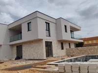 This exclusive villa, nearing completion, is designed as a semi-detached dwelling spanning two floors, each with its own entrance, yard, and garden with a swimming pool.