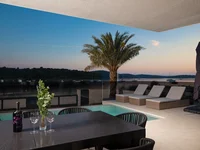 The ground floor features an open space living room with a kitchen and dining area overlooking the sea, with large glass walls leading to the terrace and pool access. The infinity heated pool offers a sea view. Additionally, some bedrooms are located on the ground floor.