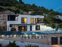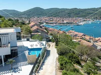 Newly Built Modern Villa with Panoramic Views of the Sea and Surroundings, Vela Luka In Vela Luka on the island of Korčula, there is a modern villa with a net usable area of 120 m². It is situated in a peaceful location on a plot of 730 m², just a few minutes’ walk from the sea, the center, and all necessary amenities. The villa is spread over two floors: the ground floor and the first floor. The ground floor is designed as an open space that includes a spacious kitchen, dining area, and living room. Large glass walls stretch along the entire length of the space, allowing natural light to illuminate the interior and providing an open view of the pool and terrace. The living room features a modern fireplace, creating a cozy atmosphere during the colder months. The first floor houses two spacious bedrooms, each with its own bathroom, providing maximum comfort and privacy. The west-facing room further stands out with its private terrace, perfect for morning coffee or evening relaxation with a view of the sunset. This villa is designed with attention to every detail, ensuring ample space for comfortable living. The interior impresses with its contemporary design and high-quality materials. The exterior boasts a large garden and a spacious terrace with a pool, ideal for relaxation and enjoying the sun. An outdoor covered kitchen with a grill and table is perfect for gatherings in the fresh air and enjoying culinary delights. Below the pool, there are two garages, and additional space allows for the construction of other structures. The villa is fully air-conditioned, and the roof is prepared for the installation of solar panels, ensuring energy efficiency. Next to the villa, there is an additional plot of land that offers excellent opportunities for expansion. On this land, an additional structure can be built, either as an extension of the existing luxury home or as a completely independent house, allowing owners to create a brand new residential object that can serve as a guest house, rental space, or similar. The villa’s orientation towards the east, west, and south ensures optimal use of daylight, while PVC joinery contributes to energy efficiency. Given its proximity to the sea, only 200 meters away, and the beach, 1 km away, this villa represents an ideal place for a peaceful and luxurious vacation or permanent residence. All necessary permits are secured, including the building and location permits, as well as the title deed, ensuring a smooth purchase and move-in process. I29191 Vela Luka