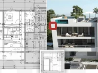 Doskonały apartament typu penthouse z tarasem na dachu i basenem do sprzedaży na drugim piętrze nowego budynku w Bibinje. Jest zorientowany na zachód, tylko 130 m od morza i 400 m od centrum miasta. Budynek jest w trakcie budowy, a zakończenie budowy i wprowadzenie się planowane jest na lato 2022 roku.