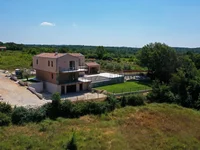 Spanning a generous built area of 377 m² on a 974 m² plot, this prime real estate in Croatia to buy offers an authentic experience of a small Istrian village, providing intimacy and complete escape from urban hustle and noise, while remaining conveniently close to the dynamic cities of Istria with their array of amenities. The comfortable villa exudes timeless charm through its architecture, partially clad in stone that seamlessly blends with the settlement and surrounding landscape, ensuring long-term satisfaction and high-quality living with superior construction standards. Designed as a single residential unit spanning three floors, it masterfully combines elegance, functionality, and comfort. The basement features a garage, a versatile multi-purpose room ideal for socializing, a billiards area, gym, or wellness zone, along with technical rooms and the pool's engine room. The ground floor includes a kitchen with dining area, living room, a bedroom with its own bathroom, and a guest toilet. The upper floor comprises an entrance hall, storage space, and three bedrooms each with private bathrooms, all offering access to a balcony.