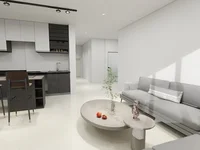 Each penthouse features a spacious open-plan living and dining area, seamlessly connected to a modern kitchen equipped with premium finishes and sleek design elements. Large windows and sliding glass doors flood the interiors with natural light and lead to generous verandas, creating a strong sense of openness and connection to the outdoors.