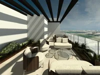 Featuring 100 m² of covered space, the apartment includes an open-plan living area, a modern kitchen with built-in cabinetry, and two bathrooms. Large glass doors connect the interior to a covered veranda, creating a bright and inviting atmosphere.