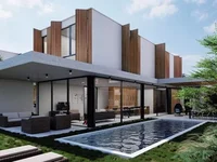 The ground floor offers a sleek, contemporary kitchen that seamlessly integrates with the open-plan living and dining area, with large sliding windows leading to the garden and optional swimming pool area. This level also includes a guest WC, a small kitchenette, a storage room, and an extra room that can serve as a fourth bedroom or office, depending on the owner's needs.