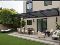 Large sliding doors lead to a charming veranda and backyard with ample space for a garden, optional swimming pool, and barbecue area, perfect for outdoor living.
