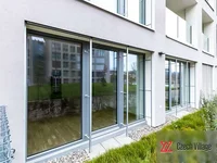 Na ósmym piętrze znajduje się wspólny taras z leżakami, stołem i ławkami z magicznym widokiem na Pragę.