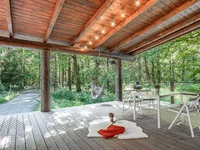 In the house: spacious living room 64 m² with M-Design fireplace, Smeg and Samsung kitchen, two bedrooms, atrium office, two bathrooms, Rehau heated floors, Vaillant heat pump, alarm.