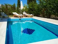 From the living room, there is a view of the pool, located in a landscaped garden with a lawn and a large barbecue area. The villa extends to 136 sq.m, and the plot has an area of 450 sq.m.