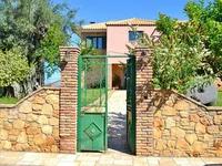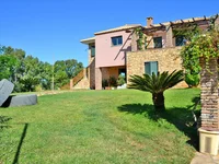 Willa, o powierzchni 600 m2, jest rozłożona na trzy piętra i została wybudowana w 2006 roku. Zewnętrzne połączenie kamienia i gipsu w miękkie tony, tworząc harmonijną integrację z naturalnym otoczeniem. Ogród jest dobrze utrzymany z zielonymi trawnikami i szlakami kamiennymi, podczas gdy weranda zapewnia cień i miejsce na relaks. Wnętrze jest gustownie urządzone, łącząc komfort i styl.