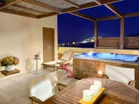 A sun rooftop terrace where you can relax in the hot tub overlooking the sea and the night lights of Rethymno, which is a short drive away.