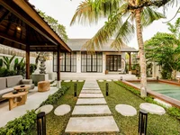 Featuring 75.6 sqm of bright, efficient living space, the villa is thoughtfully crafted with open-plan interiors, warm natural finishes, and seamless indoor–outdoor integration. Large glass doors welcome natural light and connect the living area directly to the private pool and landscaped garden, offering a calm tropical atmosphere ideal for relaxation or hosting.