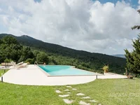 zadbany ogród z panoramicznym basenem i tarasami. Gospodarstwo znajduje się na terenie 226 hektarów ziemi, z czego 80 jest ogrodzonych: 5 ha winnic (czerwony Sangiovese), 220 hektarów lasu, 0,5 hektara gajów oliwnych, 0,5 hektara drzew owocowych.