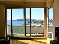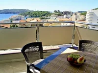 The apartment has a living room with a kitchen area, two separate bedrooms, two bathrooms and a balcony with a magnificent sea view.